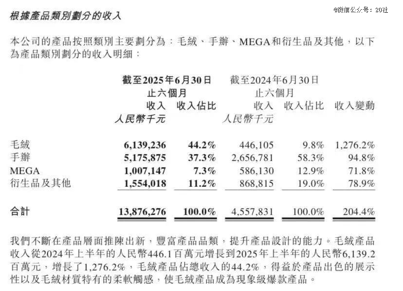 品类方面,毛绒收入占比首次超过手办。毛绒实现盈利收入61.4亿元,同比增长1276.2%,占比44.2%,超过手办的37.3%。